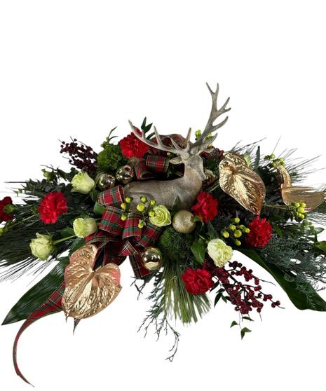 Roses, berries and carnations arranged alongside evergreen foliage in this arrangement. Gold ornaments peek through in this design for some added Christmas cheer. Arranged around a beautiful reindeer for a classy look, with some timeless winter ribbons.