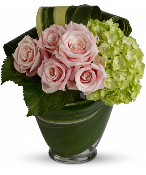 Happy anniversary or any happy occasion, this delightful bouquet of pink roses and green hydrangea is a lovely choice. Simple yet sophisticated, it is guaranteed to elicit lots of oohs and aahs.