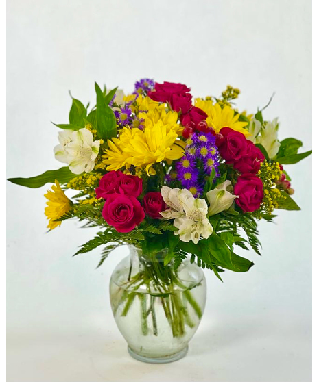 A beautiful mixed flower arrangement of roses, daisies, alstromeria and seasonal greens.