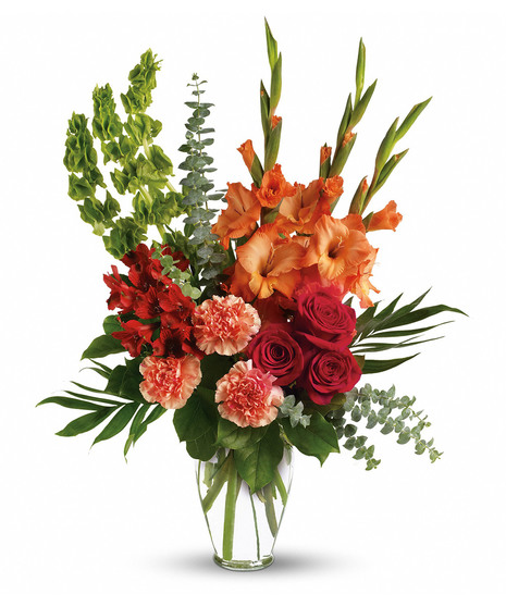 Red roses, red alstroemeria and orange gladioli in a sparkling Ming urn - a lovely tribute that sends a message of hope and healing for those mourning their loss.