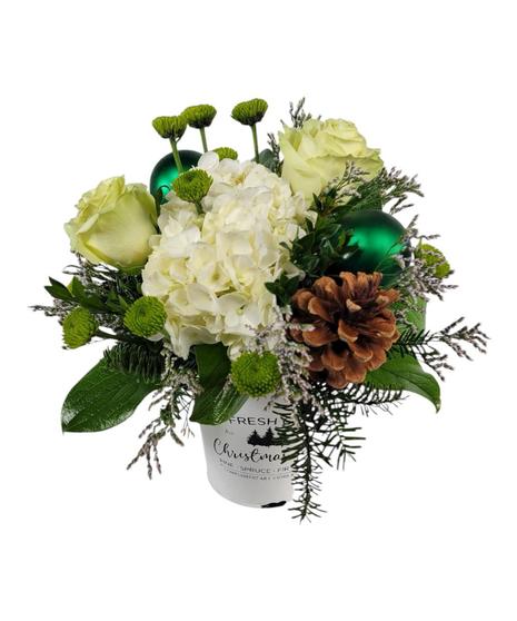 Green roses and white hydrangea arranged with emerald ornaments, greens, and pine inside our festive Christmas Tree Farms tin. Green ornaments are added to this design for an extra spark of Christmas cheer!