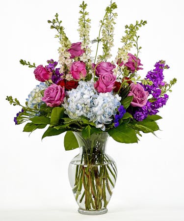 Garden assortment of purple roses, red spray roses, purple stock flowers, white larkspur, and blue hydrangea.