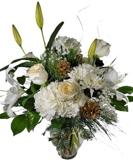 A tall design with notes of gold and white. Graced with lilies, hydrangeas, roses pine greens, and of course gold glitter.