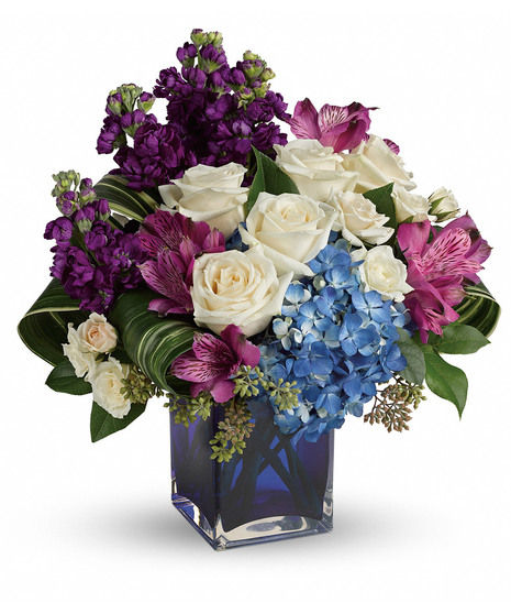 Reminiscent of a beautiful impressionist portrait, the deep purples, fresh blues and crisp whites of this stunning bouquet make an unforgettable artistic statement. What a lovely surprise on any occasion!