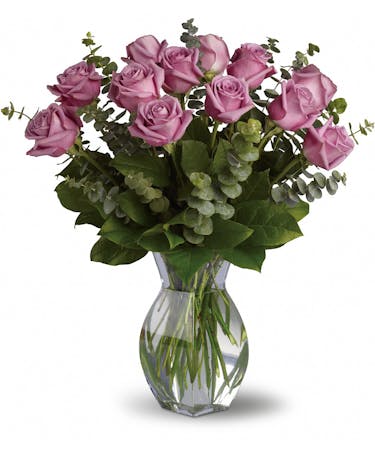 Lovely lavender roses are enchanting and exotic. They can even signify love at first sight, and when this pretty bouquet is delivered it will surely be love. Gorgeous as the roses are by themselves when mixed with the dark forest green of eucalyptus the effect is intoxicating.