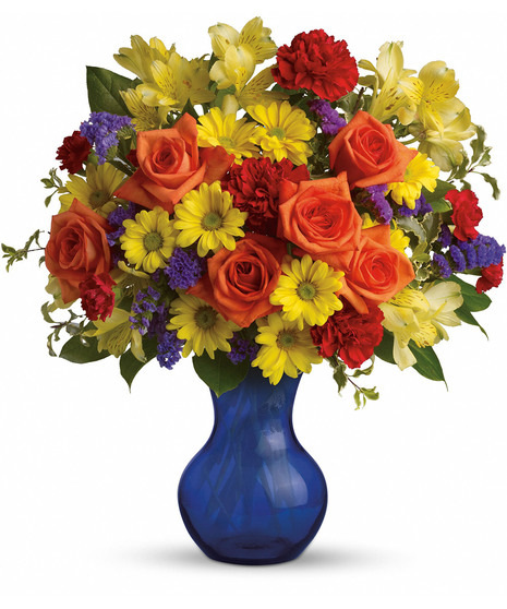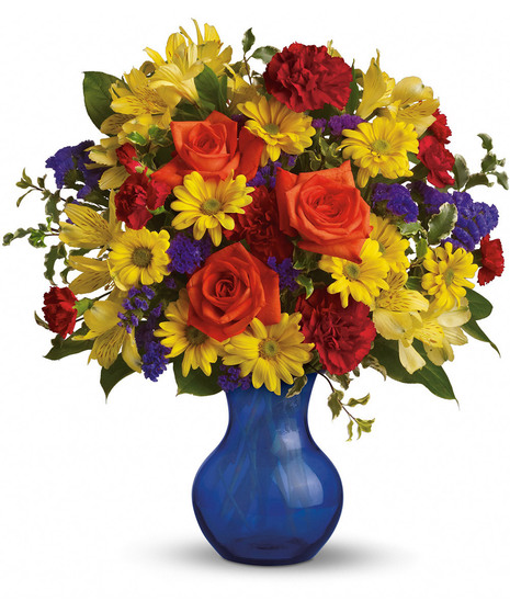 Three cheers for the season's happiest flowers in a rich cobalt blue vase! Beautifully arranged and beautifully priced, this delightful bouquet makes a brilliant birthday gift. It's also a great way to say "I'm thinking of you."